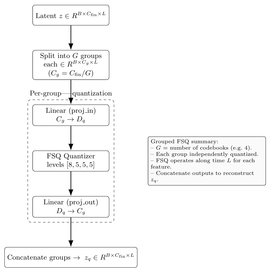 For the quantization scheme, we use grouped finite-scalar quantization, which splits the last hidden states into N groups of equal sizes, vector quantizes each independently, and then concatenates back together channel-wise