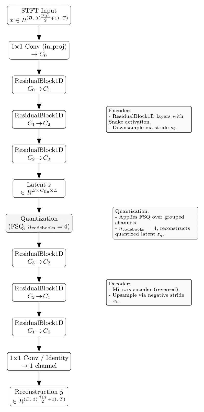 Our first stage consists of a 1D ResNet-based VQGAN that compresses small-hop STFT.