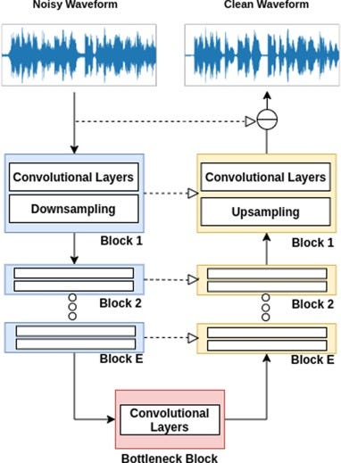 Since we’ve already observed good results previously with U-Nets (see MQGAN Refiner), we decide to go with a Wave U-Net, which is proven to work for a variety of audio-to-audio tasks, including stem separation, speech dereverberation/denoising, et al.