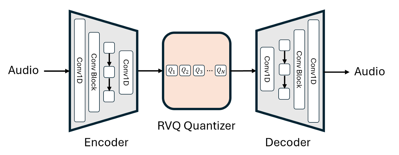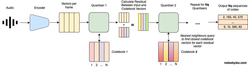 Residual VQ, introduced in the SoundStream paper, solved this by breaking the problem into stages. Instead of one giant codebook, you stack several smaller ones: the first codebook captures the coarse structure, the next captures the residual error, and so on. Now you have a stable way of scaling the bitrate.