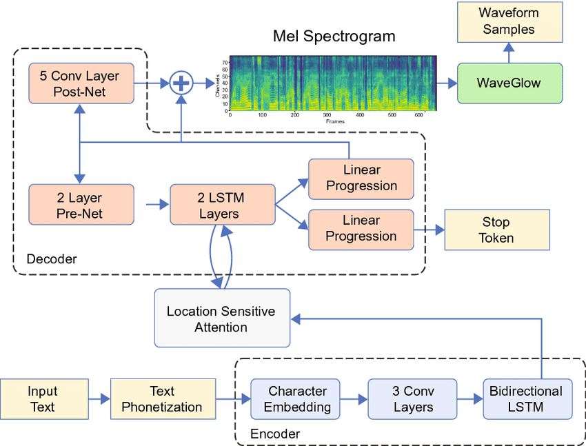 The diagram above is of Tacotron 2 + WaveGlow, which was the dominating stack in text-to-speech for quite a bit. Tacotron 2 was an RNN (LSTM)-based encoder-decoder network that used location sensitive attention to align phonemes or text to mel spectrogram, which would then be fed into the neural vocoder to extract audio.