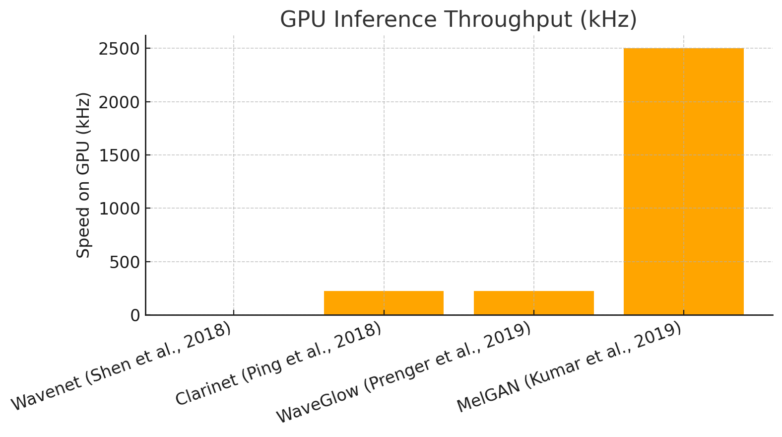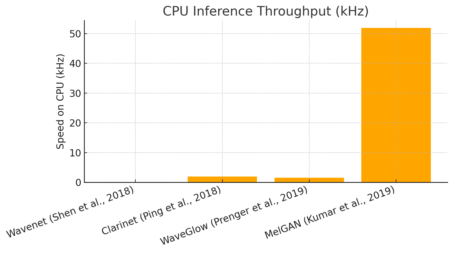 Enter MelGAN (2019), which wasn’t technically the very first audio GAN, but the first one to actually succeed. Most notably, MelGAN was 10x faster than WaveGlow.