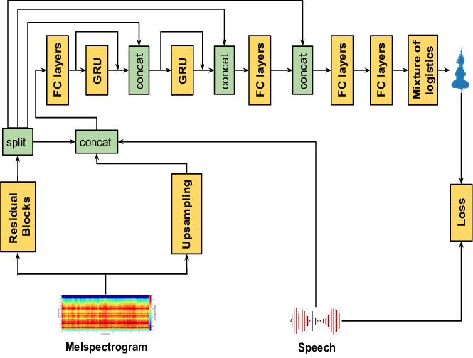 So, why GAN? As we’ve established before, audio data is quite hard to predict. Previous approaches involved autoregression (WaveNet, WaveRNN), or making the model big and complicated (WaveGlow, which took a week of training on 8 GPUs to converge a single speaker, and inference is slow).