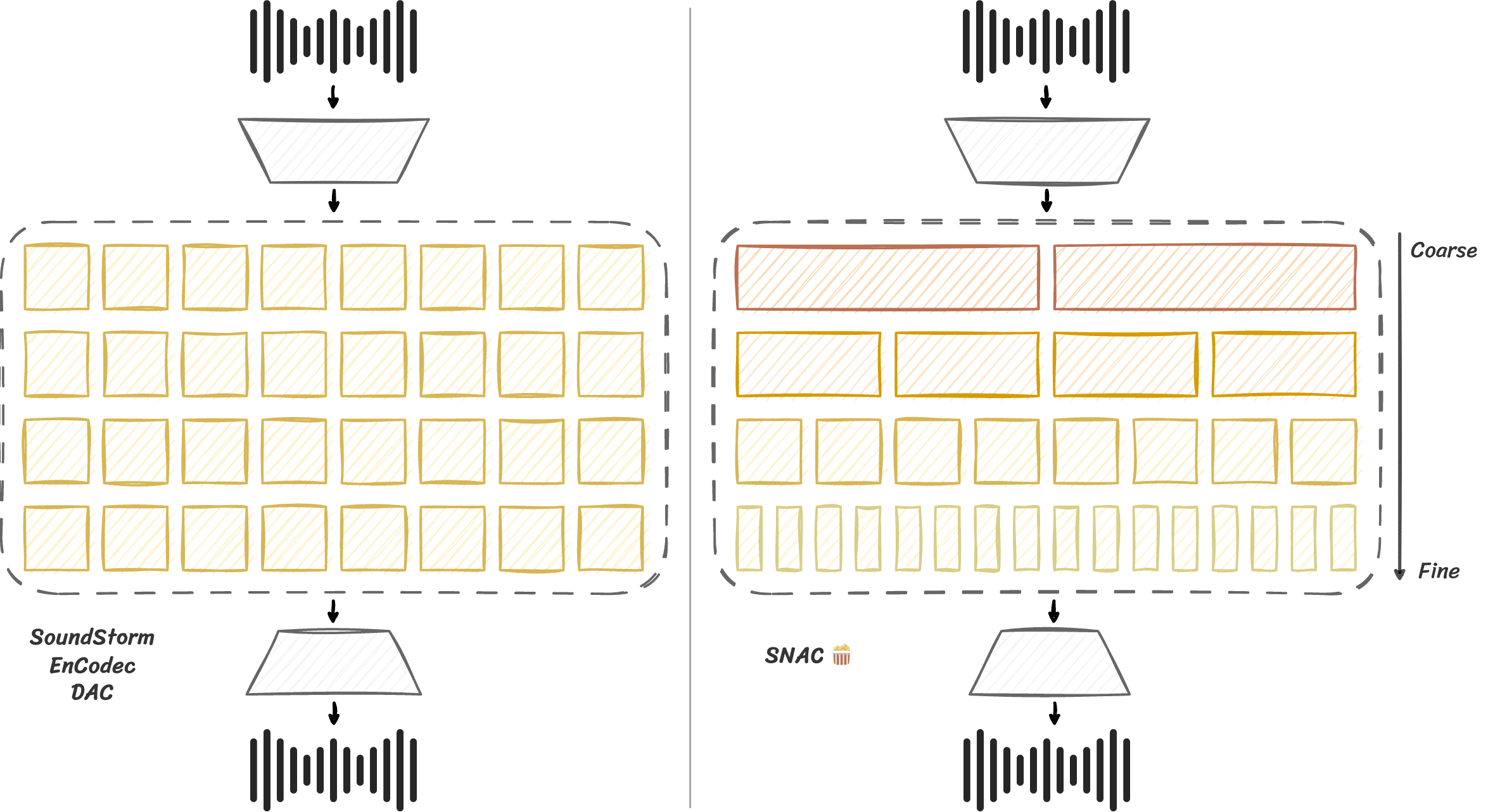 Multi-Scale Neural Audio Codec (SNAC), with its multi-scale codes and other tricks that enable much more efficiency, bring speech encoding at 24KHz down to 84 tokens/second. Now you can model 97 (ninety-seven) seconds of audio with 8192 tokens, a dramatic difference.